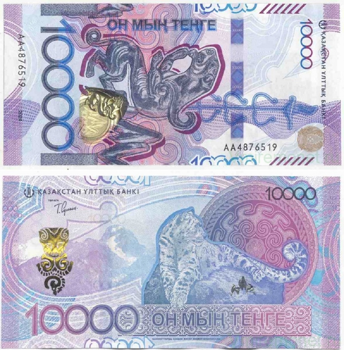 В новой серии банкнот «Сакский стиль» снежный барс появился в 2024-м году - на купюре 10 000 тенге, причём и на реверсе в реалистичном исполнении на фоне гор Заилийского Алатау, и на аверсе - в стилизованном.