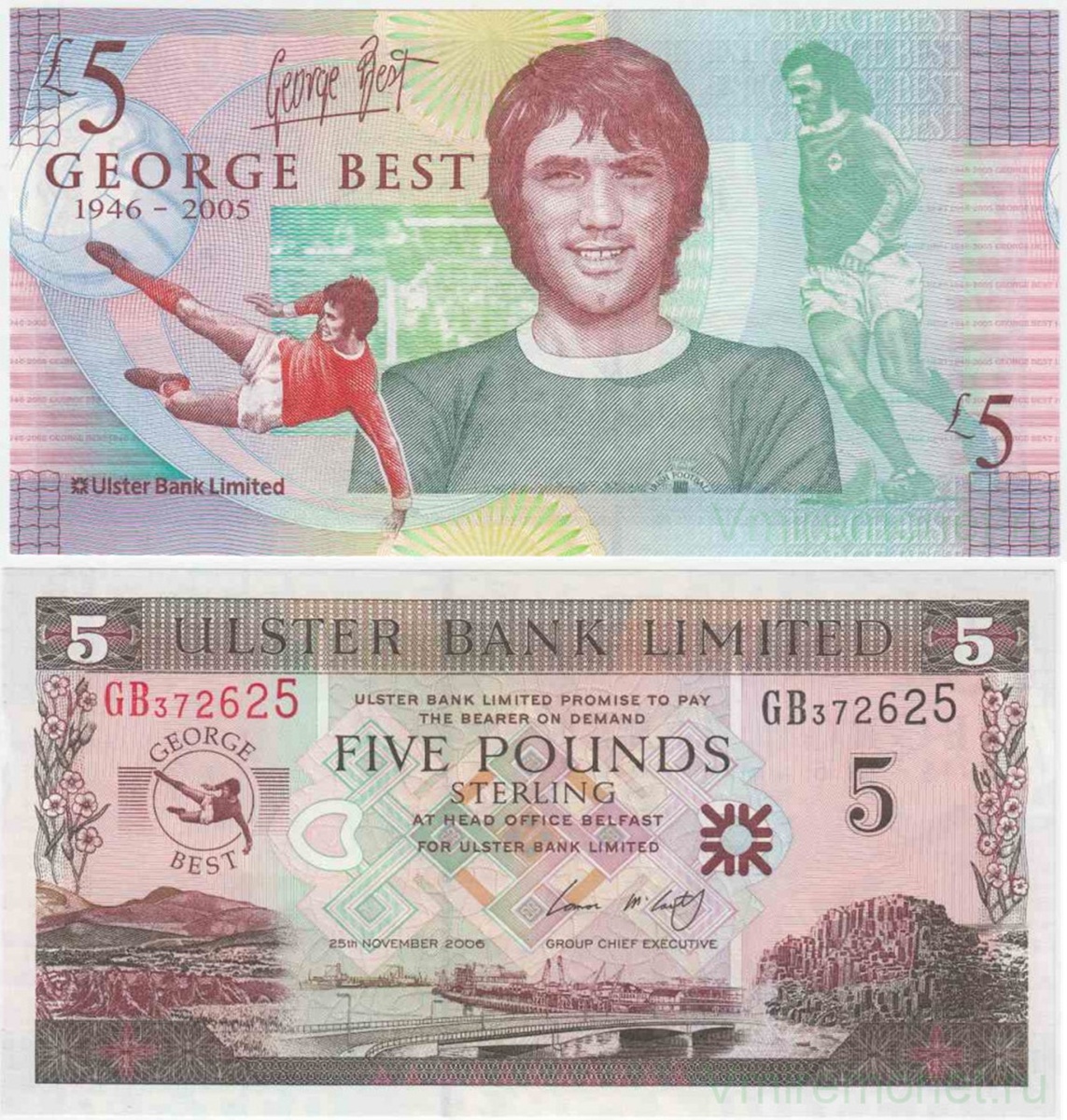 Теперь — к другим банкнотам. Юбилейная банкнота Северной Ирландии номиналом 5 фунтов была выпущена в 2006 году к 60-летию футболиста Джорджа Беста, вингера «Манчестер Юнайтед» и сборной Северной Ирландии, одному из лучших футболистов страны, который ушёл из жизни годом ранее.