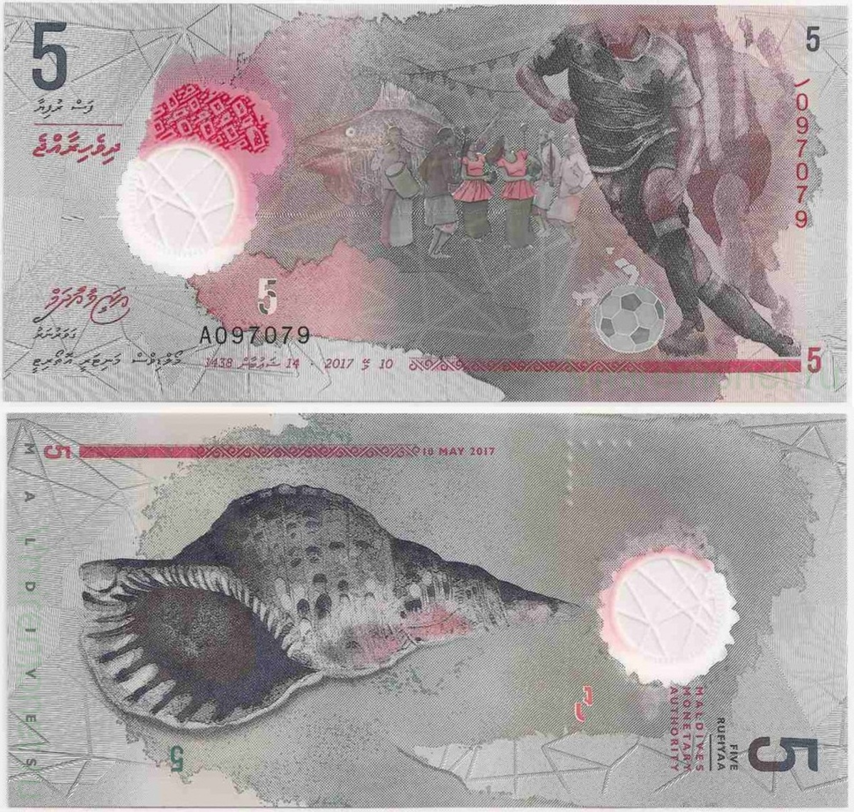 В 2017 Мальдивы выпустили полимерные коллекционные 5 руфий — самый мелкий номинал банкноты, которая имеет здесь хождение. На аверсе — Али Ашфан, нападающий и капитан сборной Мальдив, один из лучших спортсменов в Южной Азии. Лицо его скрыто, как того требуют традиции Ислама. На заднем плане — танцоры и музыканты, исполняющие национальный танец Мальдивской Республики Бодуберу. На реверсе — крупная раковина, с помощью которой созывали людей на собрания, зрелища, а также в моменты чрезвычайных ситуаций. Но все же будем думать, что эта раковина трубит к началу футбольного матча).