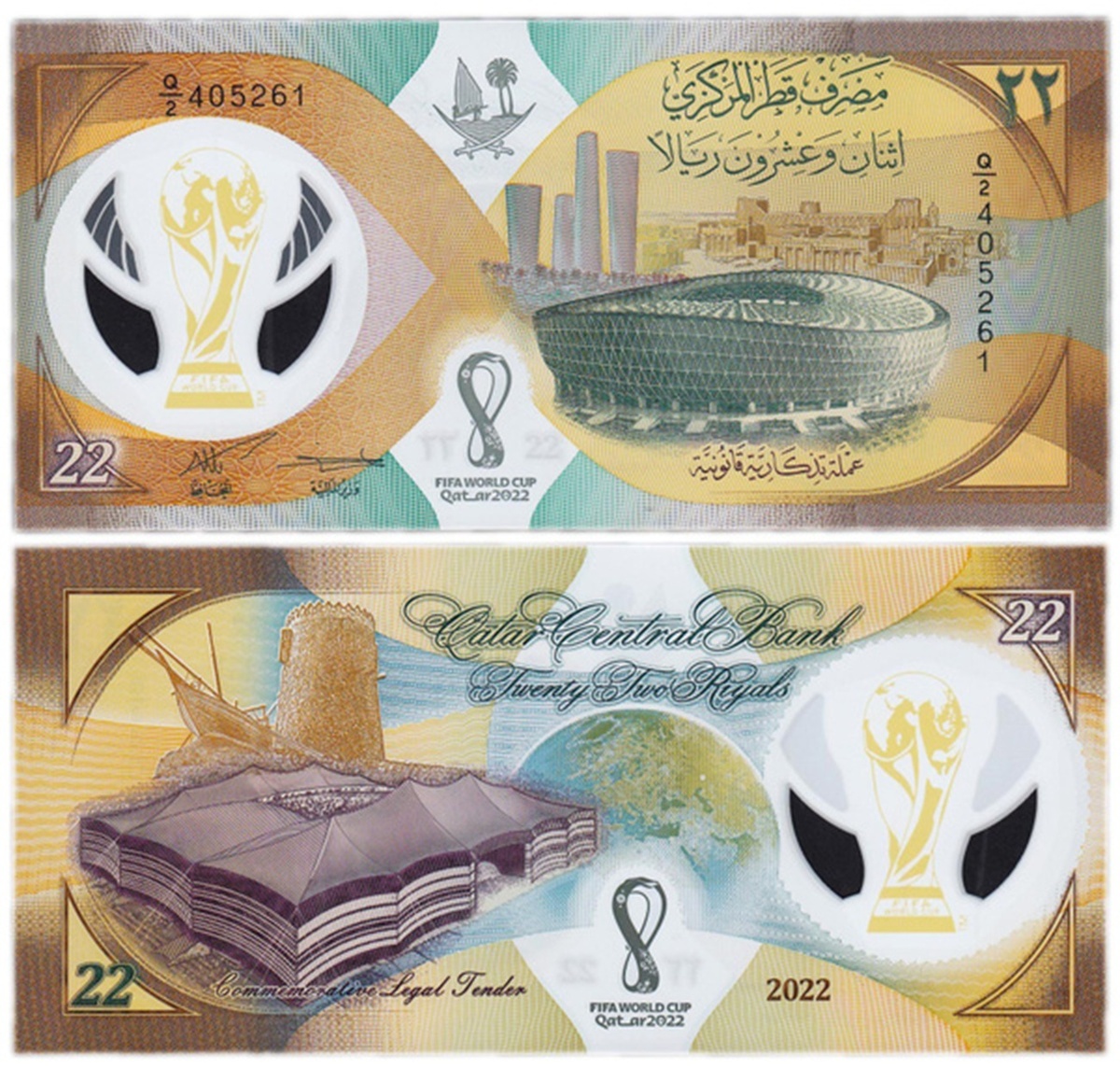 Ну и вспомним еще банкноту номиналом 22 риала, выпущенную Банком Катара. Этот необычный номинал посвящен 2022 году, когда в Катаре проходил Чемпионат мира по футболу. Здесь вперемешку представлена древняя и современная архитектура страны (включая стадионы Аль-Байт и Лусаил), а также эмблема чемпионата и его кубок. Футболистов как таковых нет, но мы уже понимаем, почему их портреты не могут быть размещены на купюре. И просто отметим банкноту как оригинальную, и тоже имеющую отношение к мундиалю.