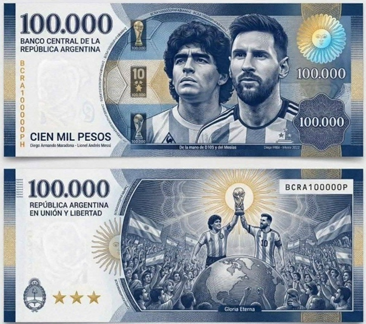 Центральный банк Аргентины планирует выпустить специальную банкноту номиналом 100 000 песо в честь Диего Марадоны и Лионеля Месси к Чемпионату мира 2026 года. На лицевой стороне купюры будут портреты двух легендарных аргентинцев, а на обороте — оба футболиста, держащие трофей чемпионата мира.