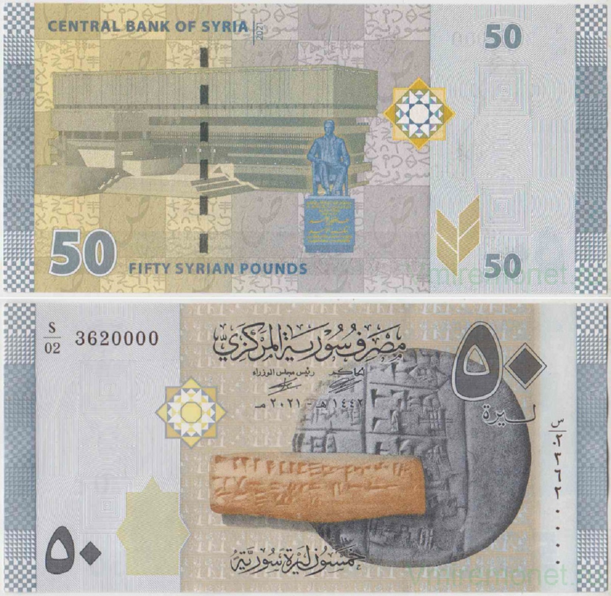 Так, на 50-ти сирийских фунтах предыдущего образца, помимо глиняных табличек из Эблы и библиотеки в Дамаске, был изображен памятник Хафезу аль-Асаду, отцу свергнутого президента Сирии Башара Асада - и сам Хафез был президентом почти 30 лет. Памятник этот благополучно снесли и в реальной жизни. Исчез он теперь и с банкнот.
