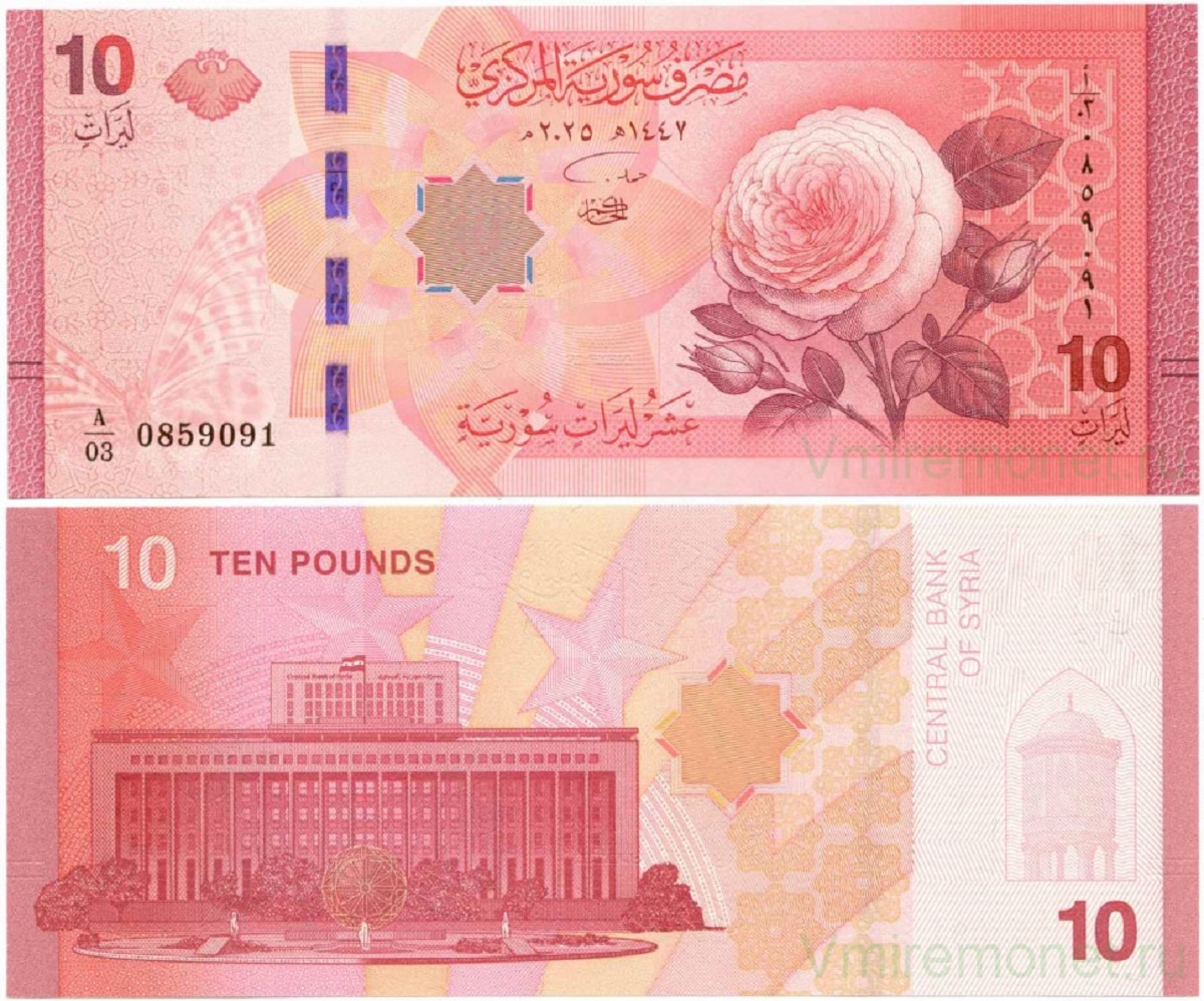 На 10 сирийских фунтах— цветок дамасской розы и бабочка.