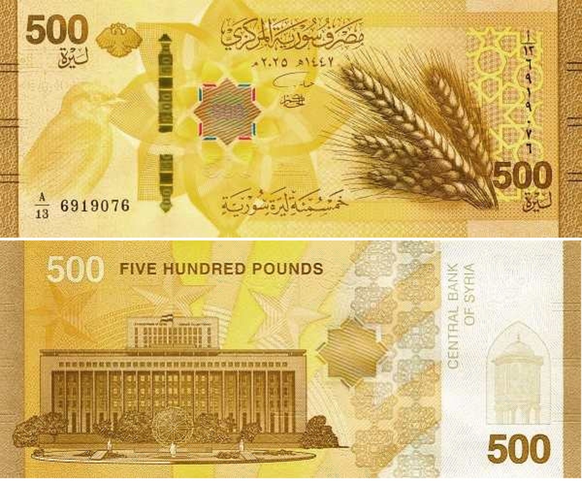 500 сирийских фунтов — колосья пшеницы, символизирующие продовольственную основу экономики страны, и полевой воробей, уничожающий вредных насекомых на полях.