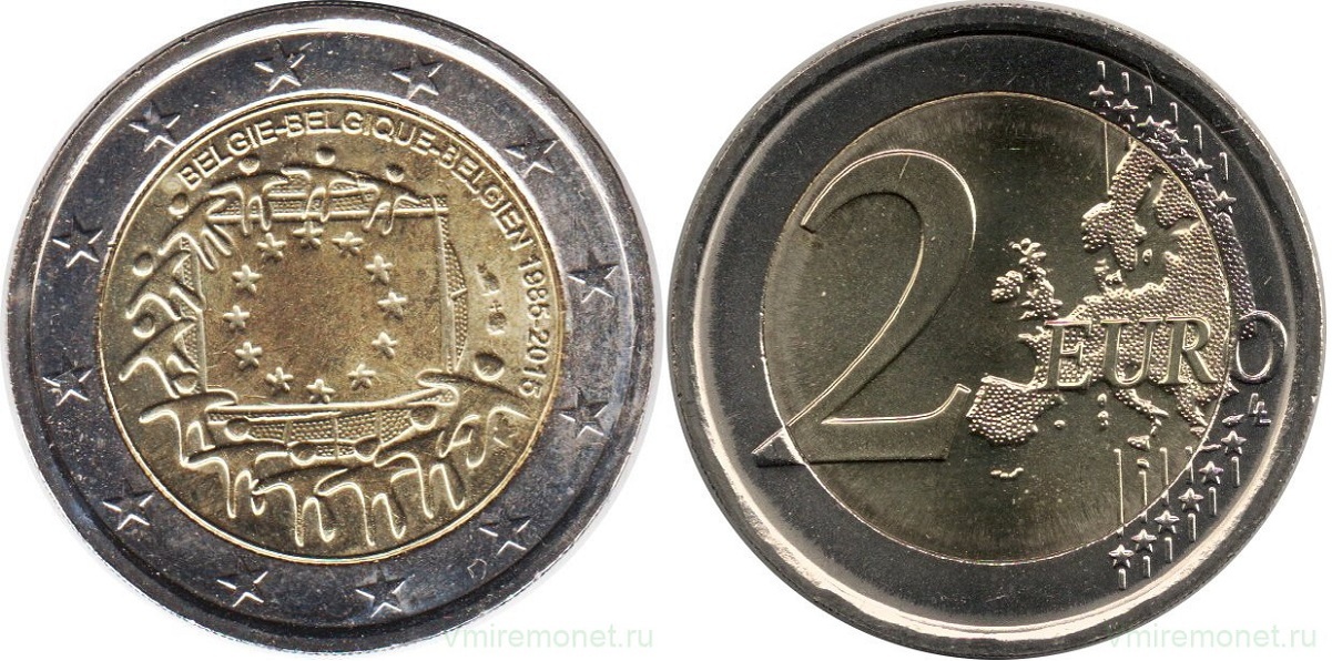 В 2015 году общеевропейская евросерия была посвящена 30-летию флага Евросоюза. Изначально синий флаг с двенадцатью золотыми звёздами, расположенными как цифры на циферблате, принадлежал Совету Европы. В 1985 году главы европейских государств утвердили его как общий флаг для всех Европейских объединений. На монете — композиция из двенадцати человеческих фигур, растянувших флаг Евросоюза на весь земной шар.