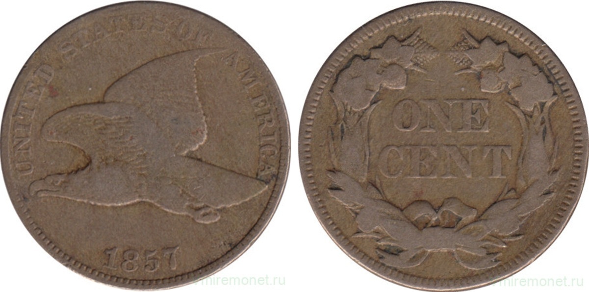 А вот на монете 1857-го года появился орел, а сама она стала медно-никелевой и уменьшилась до 19 мм - в таком размере монета дошла до наших времен. Интересные факты: этот цент стал первой монетой США, в составе которой присутствует никель (12 %). А летящая птица во многом копирует орлана на так называемом долларе Горбехта, одной из самых редких и дорогих монет США (выходила в 1936, 1938 и 1939 годах). Заменили, однако, этот цент довольно быстро, из-за досадной ошибки: гравёр не учёл, что выступающие части монеты на аверсе (клюв и хвост орла) совпадают с наиболее выступающими частями на реверсе (венок), что приводит к быстрой порче штемпелей и монетному браку.