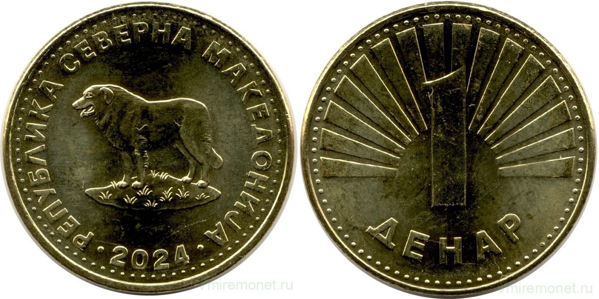 На монете номиналом 1 денар изображена шарпланинская овчарка, порода сторожевых пастушьих собак, сформировавшаяся на Балканском полуострове. Ее называют также югославская или македонская овчарка.