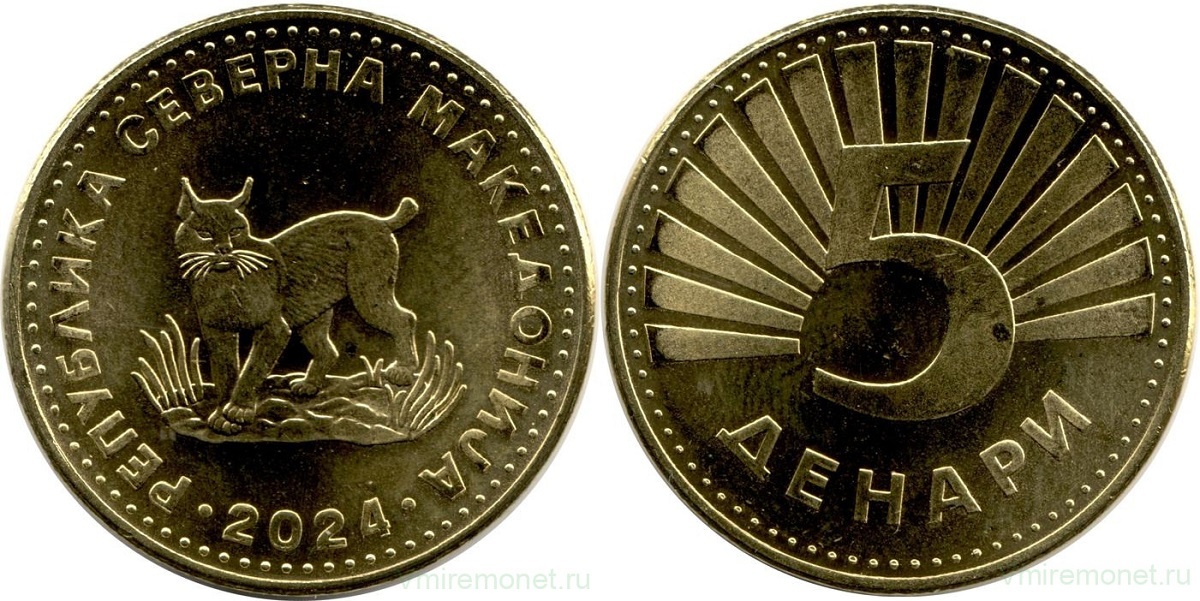 На аверсе 5 денаров - балканская рысь, которая считается одним из национальных символов республики. Она занесена в Красную книгу - предполагается, что в стране обитает от 35 до 40 балканских рысей, в основном в Национальном парке Маврово.
