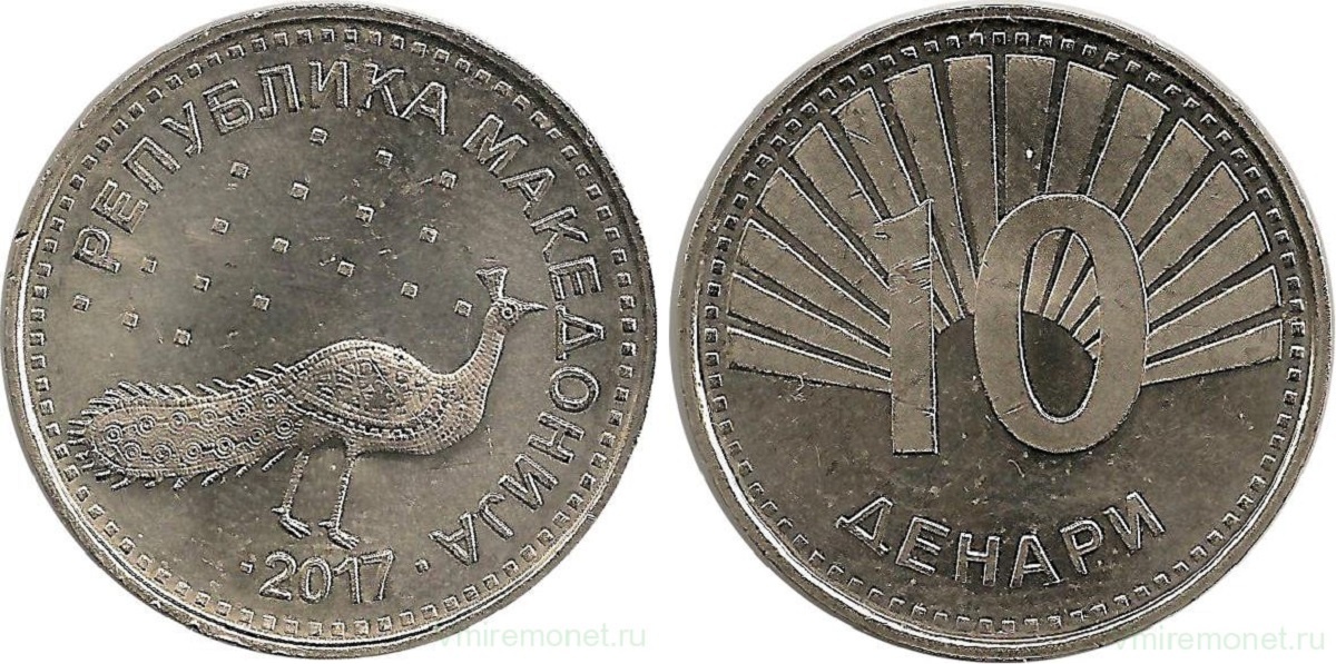 На монете 10 денаров изображён павлин с напольной мозаики византийского баптистерия IV–V века в Стоби. Соби - археологический памятник, древний город Пеонии. Павлин - раннехристианский символ, ассоциировавшийся с птицей феникс, сжигающей себя в огне и восстающей из мёртвых. Предание о фениксе стало аллегорией Воскресения Христова.