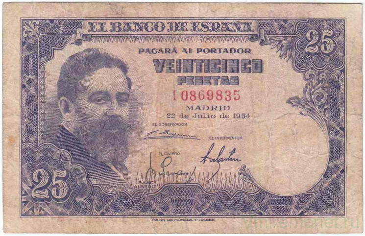 Банкнота. Испания. 25 песет 1954 год. Тип 147.