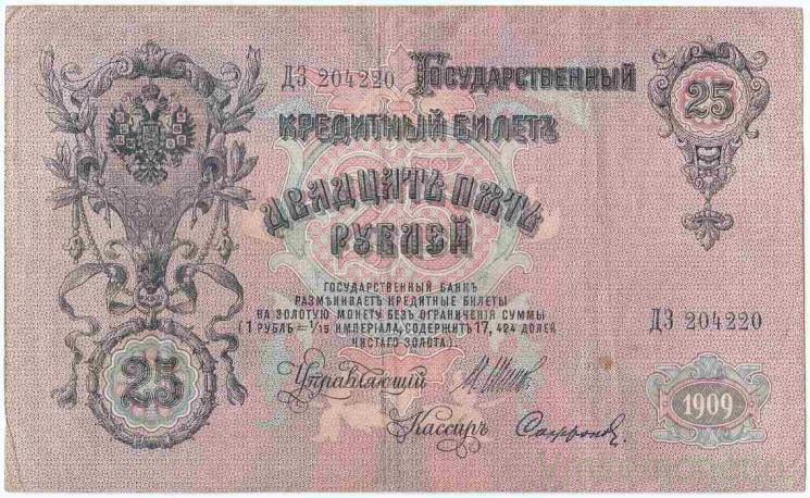 Банкнота. Россия. 25 рублей 1909 год. (Шипов - Софронов). Тип 12b(13).